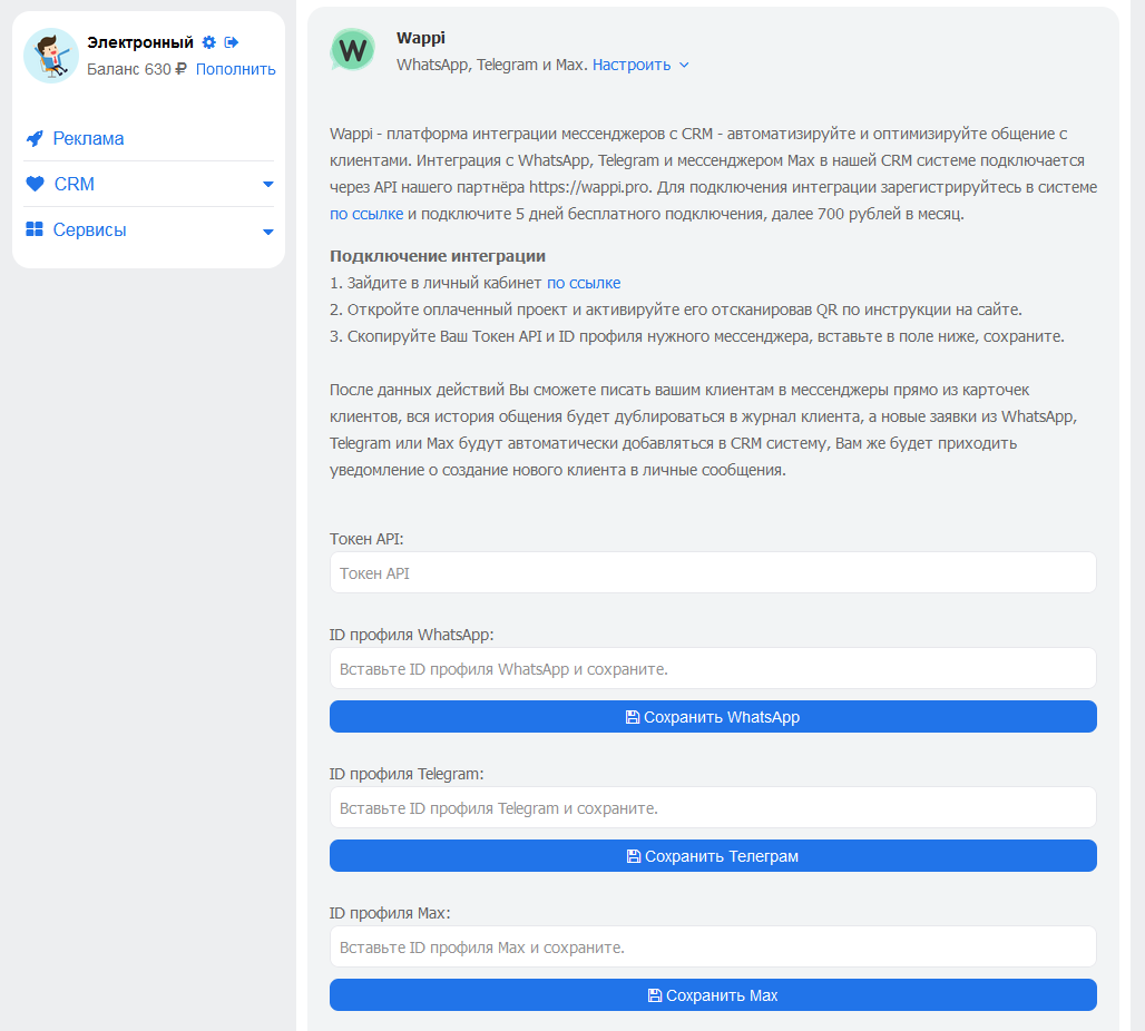 Wappi - платформа интеграции мессенджеров с CRM - автоматизируйте и оптимизируйте общение с клиентами. Интеграция с WhatsApp, Telegram и мессенджером Max в нашей CRM системе подключается через API нашего партнёра https://wappi.pro. Для подключения интеграции зарегистрируйтесь в системе по ссылке и подключите 5 дней бесплатного подключения, далее 700 рублей в месяц.