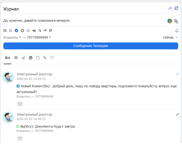 После данных действий Вы сможете писать вашим клиентам в мессенджеры прямо из карточек клиентов, вся история общения будет дублироваться в журнал клиента, а новые заявки из подключенных мессенджеров будут автоматически добавляться в CRM систему, Вам же будет приходить уведомление о создание нового клиента в личные сообщения.