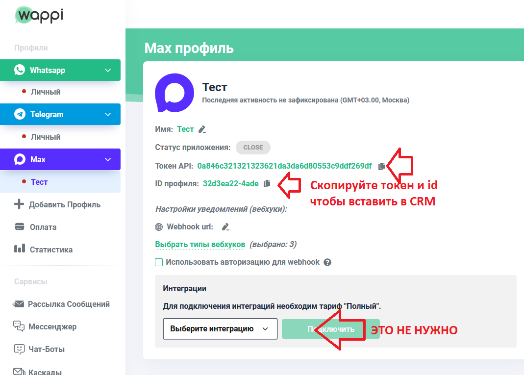 Wappi - платформа интеграции мессенджеров с CRM - автоматизируйте и оптимизируйте общение с клиентами. Интеграция с WhatsApp, Telegram и мессенджером Max в нашей CRM системе подключается через API нашего партнёра https://wappi.pro. Для подключения интеграции зарегистрируйтесь в системе по ссылке и подключите 5 дней бесплатного подключения, далее 700 рублей в месяц.